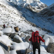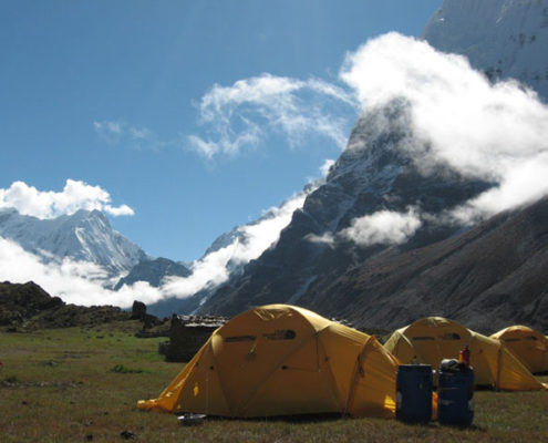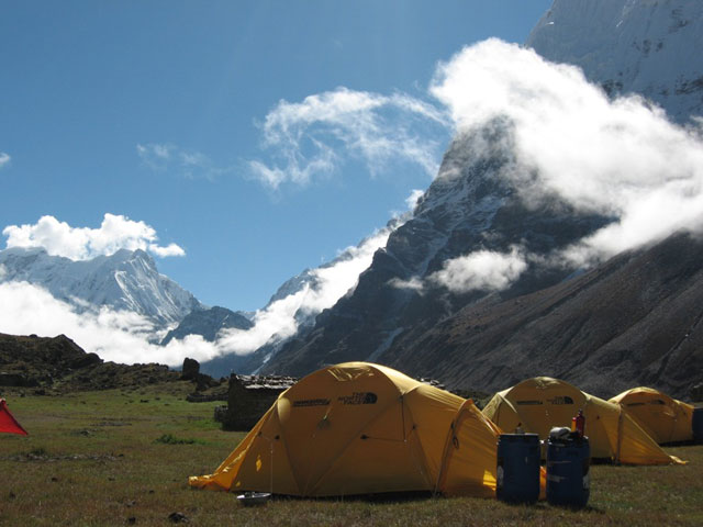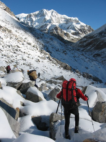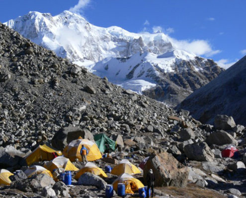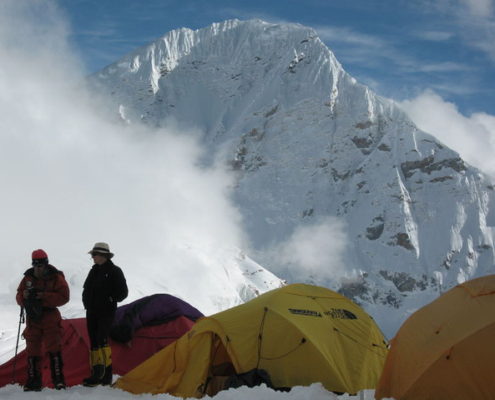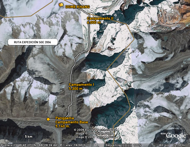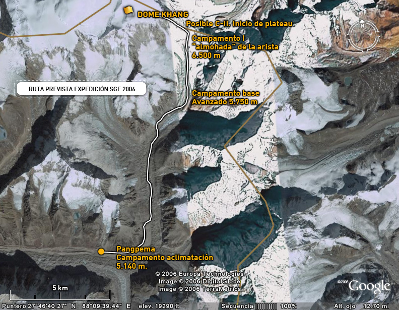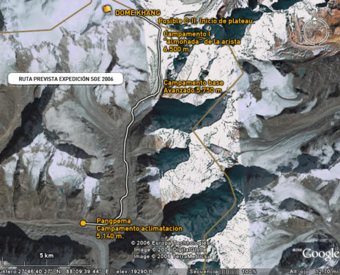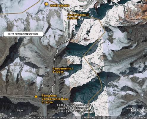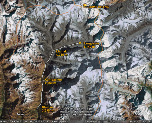 La reflexión sobre el intento en 2004 nos ha iluminado sobre los dos errores que cometimos. En primer lugar y dada la dureza y dificultad del terreno, nuestro campo base estaba demasiado alejado de las dificultades de escalada que se concentran en la arista que sube del Jonsang La al plateau sobre el que descansan los tres siete miles (Jonsang, Dome Khang y Janak). Este año vamos a tratar de montar un campo base muy alto (5.700 – 5.800m) cerca de esa arista.