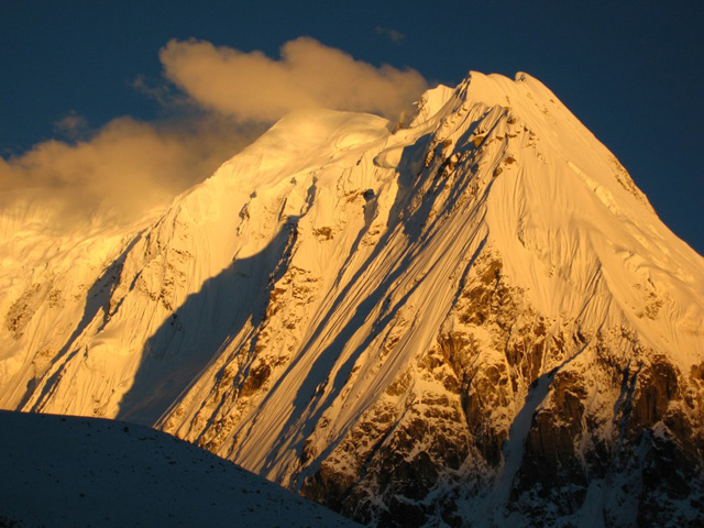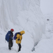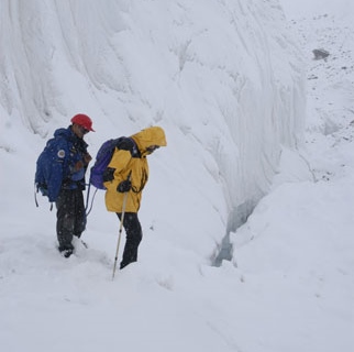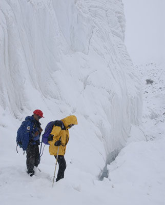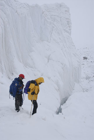 En segundo lugar, en 2004 nos empeñamos en abandonar la arista (E – O) a una altitud de 6.400m para intentar progresar por un glaciar colgado (al que denominamos Almohada) en la ladera norte del pico. Este año, creemos que después de progresar unos 200 m de desnivel por la Almohada, debemos volver a la arista para alcanzar el resalte final que nos daría acceso al plateau.
