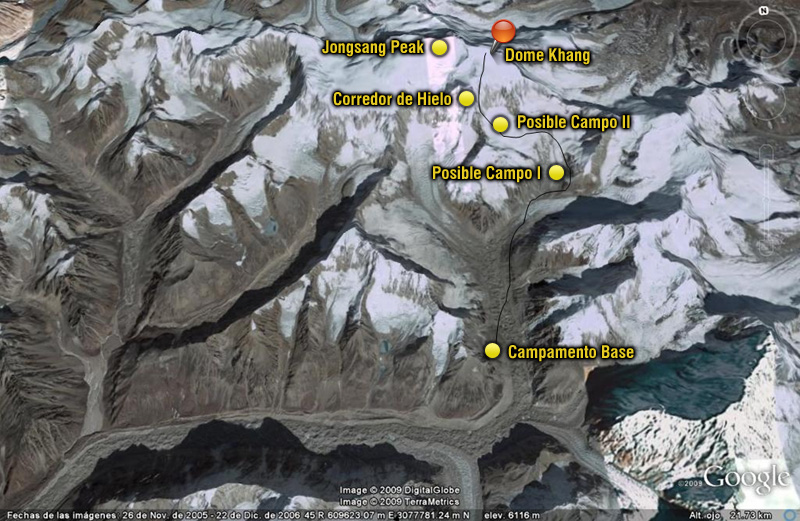 La zona del Dome Khang es remota, con una marcha de aproximación muy larga (10 días). Esta vez, vamos a abandonar los intentos de la arista Este para concentrarnos en un corredor sureste que ya fue ascendido en unas circunstancias trágicas por dos eslovenos en el 2001. Nosotros pretendemos ascender ese corredor, montar un campamento en el plateau a 7.200 m y, si el tiempo acompaña, hacer una excursión a gran altura para ascender al Dome Khang y a la “mítica” cumbre del Jongsang Peak 7.460 sólo ascendido previamente por Dyhrenfurth en 1930 (y por una expedición india en 1983). El objetivo es la primera ascensión absoluta al Dome Khang y la primera ascensión al Jongsang desde Nepal.