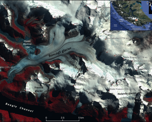 El Glaciar Roncagli (o también conocido como Alemania; 54º50’ S, 69º17’ W) se ubica en la parte SE del Campo de hielo Cordillera Darwin, el cual con una superficie aproximada de 1.800 km2 supone la tercera masa de hielo más grande de América del Sur después del Campo de hielo Patagónico Sur y Norte, con 12.300 km2 y 3.700 km2 respectivamente. Este glaciar, el tercero más grande de Cordillera Darwin con aproximadamente 116 km2, fluye como si fuese un río de hielo de 22 km desde la cumbre del Monte Roncagli (2.230 metros) hasta las cercanías del Canal Beagle (a nivel del mar) donde se encuentra su frente en paulatino retroceso y dando lugar a una expansión de su lago proglaciar. El lugar no cuenta con exploraciones científicas de ningún tipo y su conocimiento solo se limita a unas pocas expediciones alpinísticas que estuvieron escalando en el sector o cruzaron el campo de hielo de una vertiente a otra. Por consiguiente, su remota ubicación, los peligros constantes de los mundos de los hielos y la constante combinación de fuertes vientos, intensas precipitaciones, y muy cortas ventanas de buen tiempo ejemplifican las condiciones patagónicas del extremo austral de América del Sur.