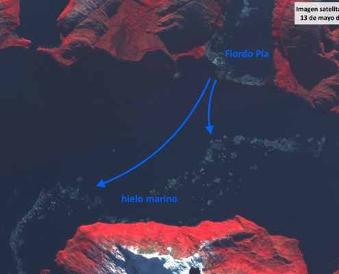 Adicionalmente, también se dejaron instaladas una serie de termómetros distribuidos por todo el área de estudio, además de una estación meteorológica automática que servirán para conocer las condiciones meteorológicas locales que impactan en la zona de ablación (zona donde la pérdida/derretimiento del hielo es mayor a la ganancia). Eñaut instalando la estación meteorológica automática en las cercanías del glaciar Roncagli (izquierda), y recorriendo su zona de ablación con las montañas más altas al fondo (derecha). Por último, pero no por ello menos importante, analizamos para la Armada de Chile el evento de hielo marino observado en el Canal Beagle entre el 12 y 13 de mayo de este año. Este suceso, no es insólito pero si muy inusual en un canal como el Beagle donde supone un riesgo extremo para la navegación. Por ello, informamos a la Autoridad Marítima de Chile de este evento para que pudiesen informar a todas las embarcaciones de la zona de este riesgo.