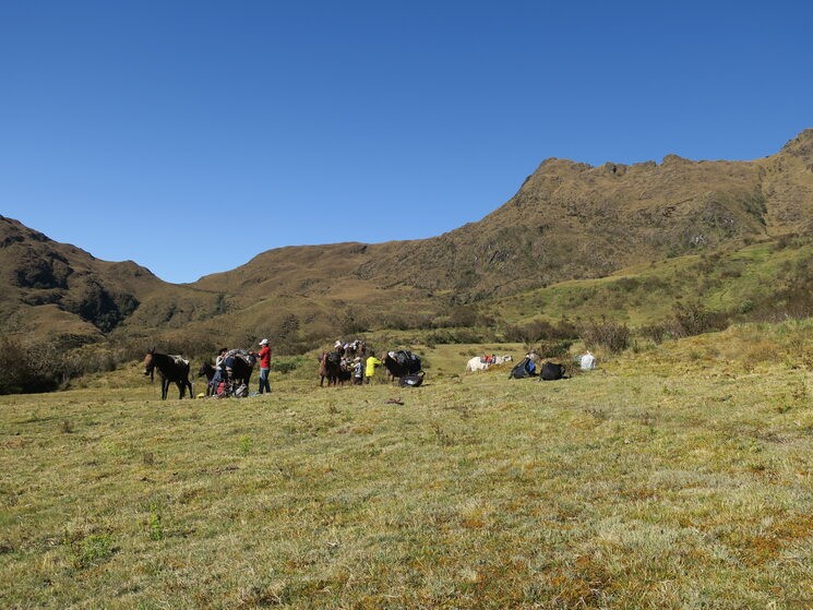 El jueves 7 de julio nos pusimos en marcha a las seis de la mañana para regresar desde Toroc hacia Pampaconas, sabiendo que esta jornada es larga y muy exigente, sobre todo por el primer tramo de casi nueve kilómetros en el que hay que subir 1.604 metros; desde los 2.198 metros de altitud de Toroc hasta los 3.830 metros de altitud del abra de Ushnuyoc.