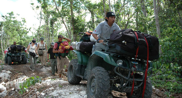 Los últimos kilómetros antes de llegar al Cenote Pedrín fueron los más duros, ya que tuvimos que cubrirlos a pie, bajo un calor sofocante por encima de los 40ºC. Dos grandes motos todoterreno (quads) nos ayudaron a transportar el equipo de buceo y filmación -más de una tonelada de peso-.