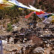 A primera hora y en ayunas, como mandan los cánones budistas, ha tenido lugar la tradicional puja (ceremonia de ofrendas) en los campamentos base de las expediciones de montaña al Himalaya. En este caso es la primera que se celebra en el Kogichwa Khola. Como el lama ya había regresado a Mugu con los caballos y los porteadores antesdeayer, fue el sirda (sherpa jefe) el que ejerció de maestro de ceremonias ante un chorten improvisado con varias piedras que hacen las veces de altar. Se realizan ofrendas tanto de comida: una pasta a base de tsampa (harina de trigo) y mantequilla, galletas, ¡palomitas de maíz! y arroz, como de bebida: coca-cola (marca registrada, la bebida de los dioses), cerveza (Tuborg, ya puestos a hacer publicidad) y té tibetano (té, sal y manteca de yak). A continuación se realiza una pequeña fogata y se lanzan el arroz y la harina al aire hasta tres veces. Después de la ceremonia ya se puede picar de las ofrendas. Tomando el chorten como centro, se despliegan radialmente 5 filas de banderas multicolor que contienen mantras budistas. Cada una de las filas representa a cada uno de los cinco elementos: agua, tierra, fuego, aire y éter. Como podéis ver en las fotos, le da un toque de color al campamento base.