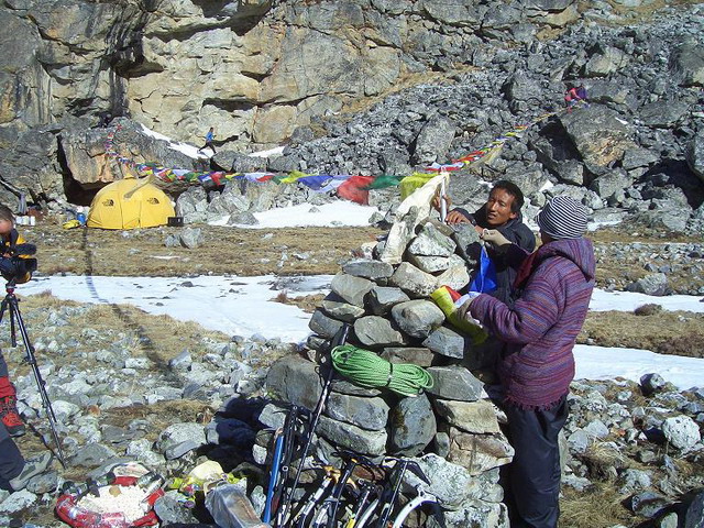 El paisaje ha cambiado notablemente: las laderas que delimitan el valle son más escarpadas y los cultivos en bancales han dado paso a paredes de roca. Este mediodía hicimos un alto para comer junto al asentamiento de Chhaila. Está formado por alrededor de cinco casas de madera y piedra en las que habitan otras tantas familias. Viven de lo que cultivan y de las escasas cabezas de ganado que poseen: economía de subsistencia pura y dura. Nos comentaron que se está intentando establecer una ruta de comercio entre Chhaila y Mugu. De hecho, en nuestra ruta no encontraremos más poblados hasta que lleguemos a Mugu; tan sólo algunas cabañas dispersas a lo largo del valle, como es el caso de Dungedhara, donde hemos acampado. Por cierto, que el agua baja cada vez más fría…