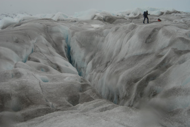 En los pocos momentos que las nubes se retiraban el paisaje resultaba sobrecogedor. Nuestro camino de hielo apenas surcado por el hombre y flanqueado por murallas de granito oscuro apenas apreciables en la lontananza, se extendía en dirección Sur hacia un horizonte de hielo. Así transcurrieron los veinticinco días de recorrido por el hielo hasta el punto en que abandonamos el glaciar y, como barco que toca tierra después de una travesía, abandonamos los esquís y caminamos paralelos a la rimaya con rumbo poco definido, era el 13 de diciembre de 2007. Nuestro viaje no había concluido y aún deberíamos llegar a algún lugar civilizado.