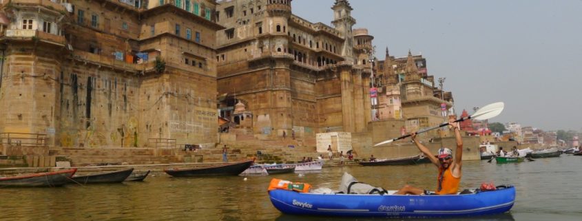 En pleno festival Dipawali, la navidad india, la ciudad y los ghats (escaleras que dan a las aguas del río) están abarrotados de peregrinos y turistas indios y extranjero. Las barcas de alquiler no dan a basto y la orilla es un auténtico bullicio…no cabe duda que llegar aquí en barca es el medio ideal y más cuando has usado sólo “human power” desde el nacimiento del río. Luego el caminar con las barcas por las estrechas calles del barrio antiguo hasta alcanzar el hostel será otra cosa aunque una buena ducha, cena y el dormir en un ambiente seco bien merece el esfuerzo.