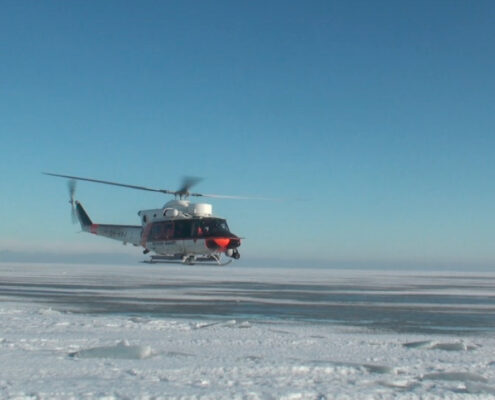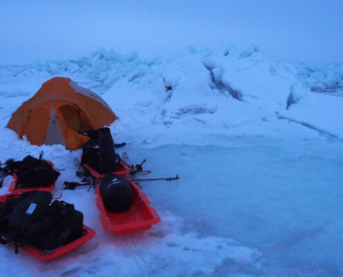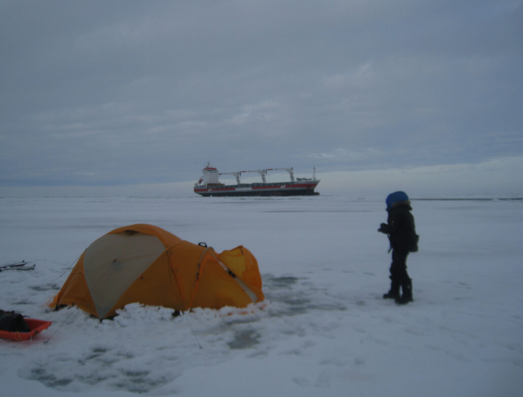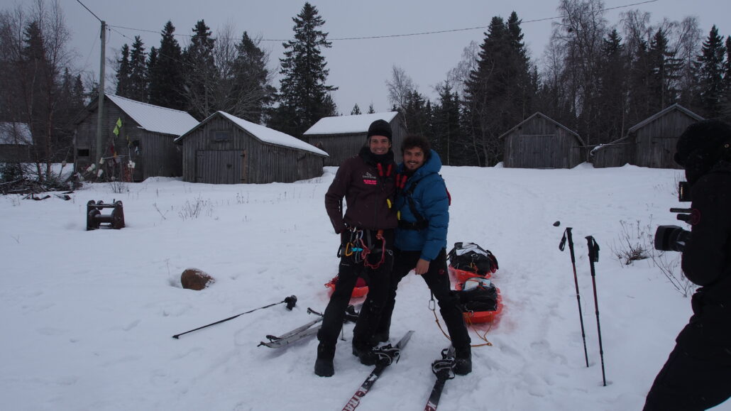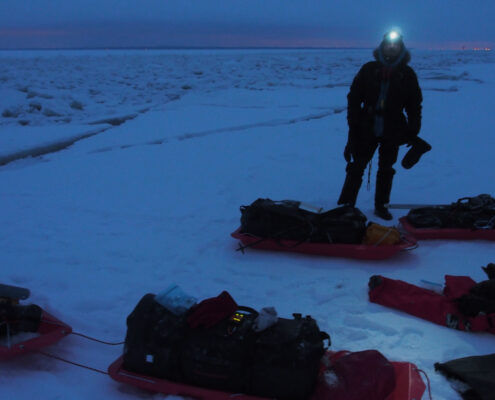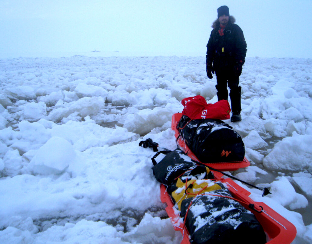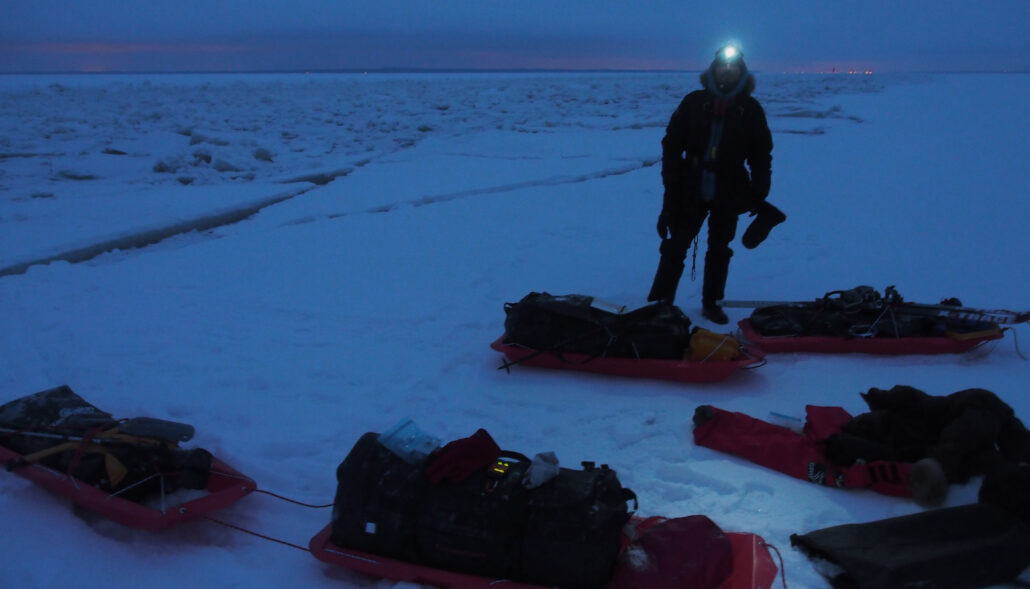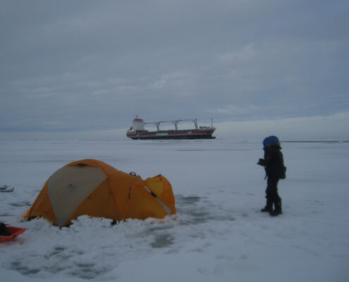 Paco Acedo añade que “otro de los momentos más tensos fue comprobar al amanecer que el hielo sobre el que habíamos acampado, cerca de uno de uno de los canales abierto por los rompehielos durante la noche, se había fracturado y nos encontrábamos sobre un témpano de hielo flotante rodeado por enormes grietas. Incluso, en algunas partes de nuestra travesía, nos vimos sorprendidos por el gran tráfico de rompehielos y enormes cargueros que habitualmente operan en la zona en esta época, que poco a poco agrandan los canales hasta incluso los 200 metros de anchura. Puesto que el canal no congelaba tuvimos que asumir riesgos para cruzarlos saltando sobre los bloques de hielo para lograr alcanzar la otra orilla. En una ocasión, un helicóptero de los guardacostas finlandeses se presentó para hacernos retroceder indicándonos que estábamos en una zona muy peligrosa, pese a que finalmente nos permitieron continuar asumiendo por nuestra parte el riesgo que suponía”