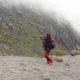 Al principio ascendemos por terreno rocoso, subiendo por una pared y por caminos entre rocas, hasta llegar después de 1h 30min al borde del glaciar, a 4.900 metros. Allí nos ponemos los crampones y nos encordamos, antes de entrar en el glaciar. La primera parte del glaciar es mitad hielo, mitad roca. El crujido de los crampones en el hielo es el único sonido que escuchamos, pues avanzamos en silencio, concentrados en la ascensión y en nuestros pensamientos. Subimos en plena oscuridad, tu campo de visión son los metros de alcance de la luz del frontal, y no tienes conciencia de lo que te rodea.