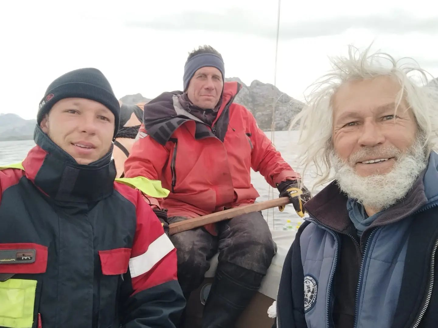 17.00 El viento silba y ruge, presionando el trimarán sobre el guijarro. Decidimos escondernos más profundamente en la bahía, arrancar el motor, adentrarnos en la bahía. Vemos un pequeño cerquero de pesca bajo la orilla izquierda detrás de la roca. Estirado sobre cuerdas. Llamamos, preguntamos por el pronóstico del tiempo, cuándo y a dónde van. 7 hombres pescadores. Al principio, parecían asustados. Poco a poco, en el proceso de conversación y especialmente cuando les dimos calendarios a los pescadores, los pescadores comenzaron a sonreír y a tomarnos fotos.
