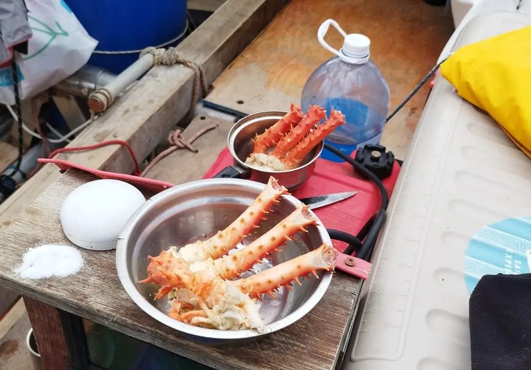 19.00 para el almuerzo y la cena patas de cangrejo hervidas. Delicioso. Fresco. El pescado es muy pequeño, frito en general marchito, en el diente. Fideos hervidos.
