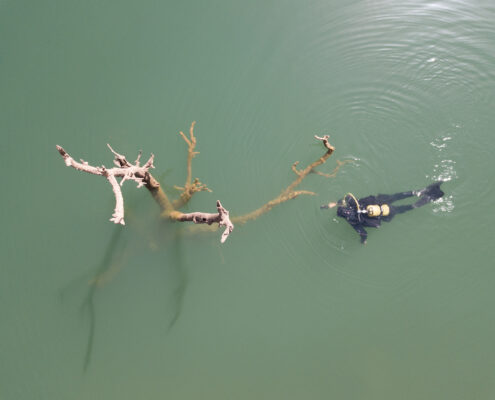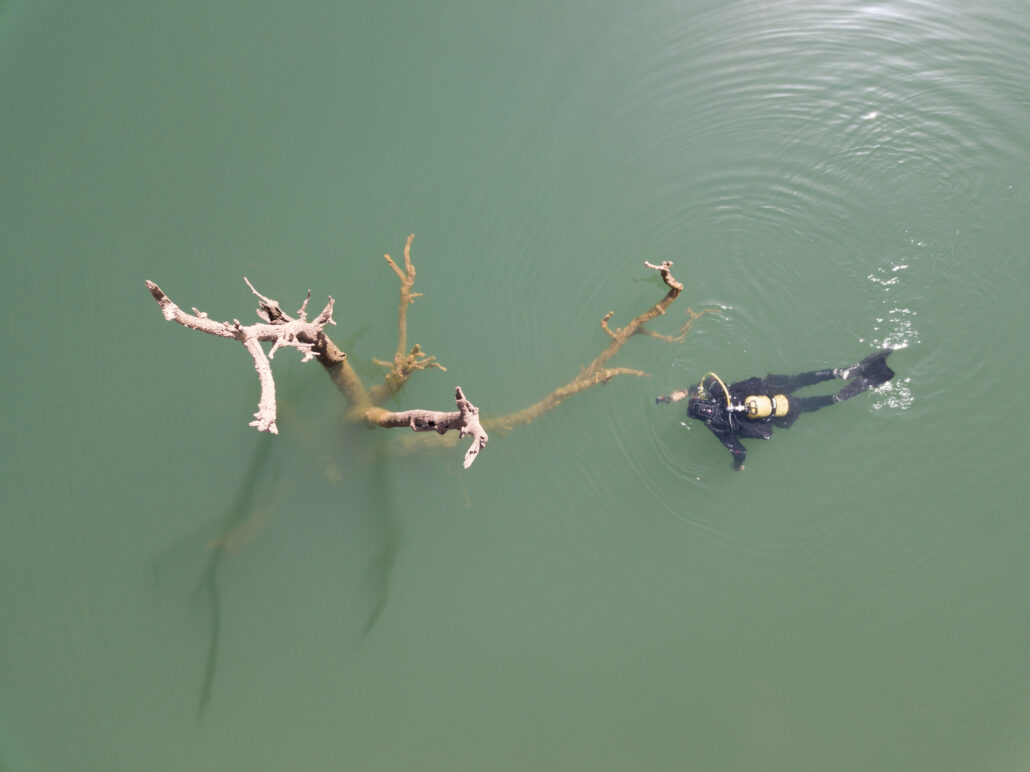 Sí, me da miedo bucear en un pantano. Bastante además. Un miedo irracional sin duda, pues poco más que muros, árboles muertos y piedras salieron a mi encuentro. Ninguna mano me agarraría la pierna, ninguna corriente me arrastraría hacia la presa (bueno, era poco probable), ninguna especie de animal del pasado me esperaba en el fondo.