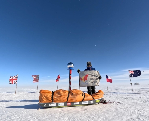 La expedición tiene un objetivo que va más allá de lo personal: inspirar y sensibilizar sobre la fragilidad del ecosistema polar en un momento en que las condiciones climáticas presentan una significativa alteración que ha venido transformando el “rostro del planeta”. La proeza que se ha propuesto de la Rosa se convierte así en un llamado a la conciencia colectiva, recordándonos que la Antártida, ese vasto desierto helado tan ajeno, guarda en sus profundidades la historia y el futuro del clima de la Tierra, debido a su particularidad de resguardar la mayor cantidad de agua dulce del planeta. El Polo Sur Ceremonial es un área en la Base Amundsen-Scott. Consiste de una esfera metálica en un pedestal junto con banderas de firmantes del Tratado Antártico. Se localiza a pocos metros del polo sur geográfico, que está marcado solamente por una señal y una estaca. La razón es que la capa de hielo se mueve 10 metros por año. La estaca se cambia de lugar cada año en Año Nuevo.