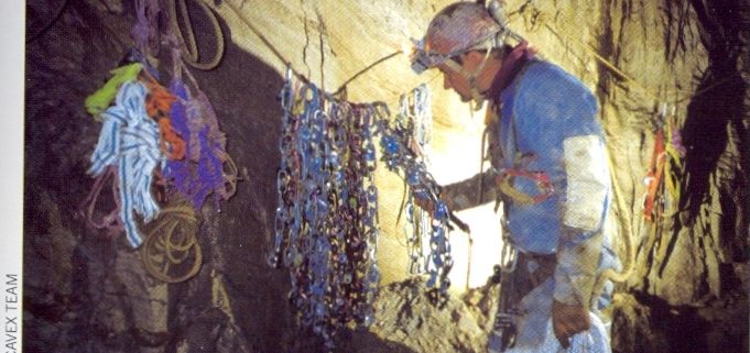 Tras estas vicisitudes fronterizas, el 4 de septiembre comenzábamos por fin a reequipar la sima, retocando aquí y allá la instalación para adaptarla, donde hacía falta, a nuestras cuerdas de 7 y 8 milímetros. De todos modos, en esta primera fase utilizamos en general la cuerda ucraniana que habían dejado en cabecera de pozo, de 9 y 10 milímetros.