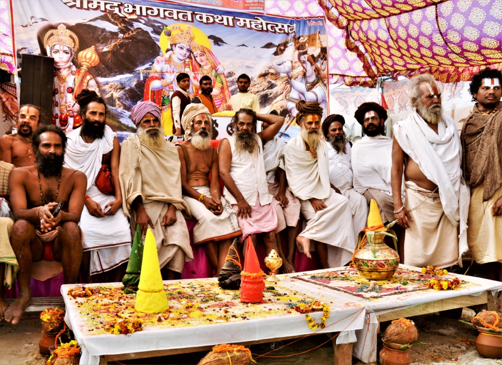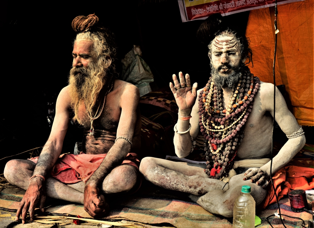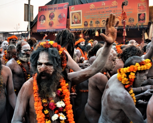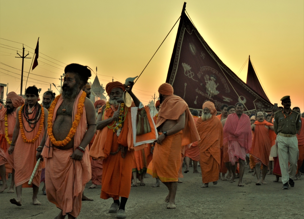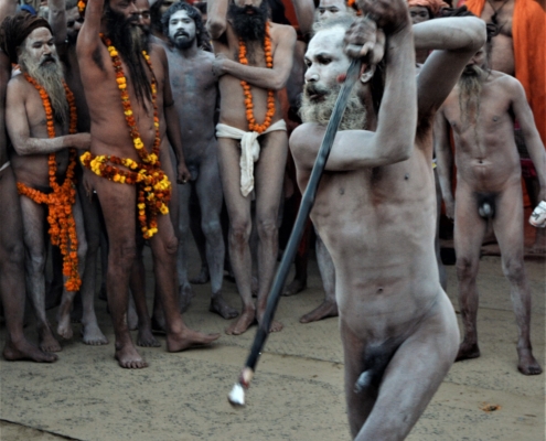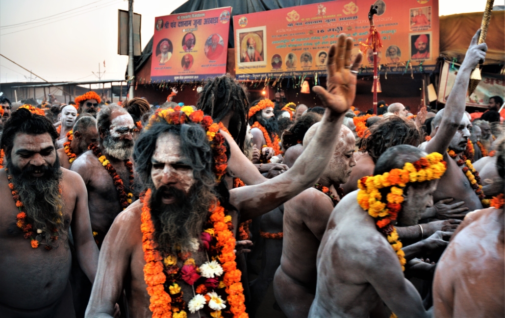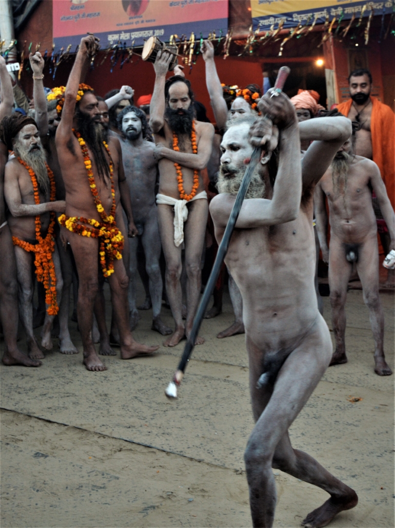 Entre las distintas categorías de sadhus destacan los nagas. Suelen pertenecer a una organización religiosa y abren las procesiones en los días de baño real al grito de Har Har Mahadev, una alabanza a Dios. Van desnudos en señal de desapego adornados con guirnaldas de flores en forma de collar o corona. El cuerpo pintado con ceniza procedente de sus fuegos sagrados, que recuerda las piras funerarias y la fugacidad de la vida. Proceden de órdenes militares de monjes guerreros, similares a las de Europa en la Edad Media. Su carácter guerrero continúa presente en sus danzas y en los instrumentos que portan en las procesiones, como espadas, tridentes y lanzas.