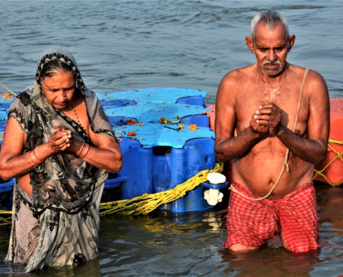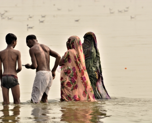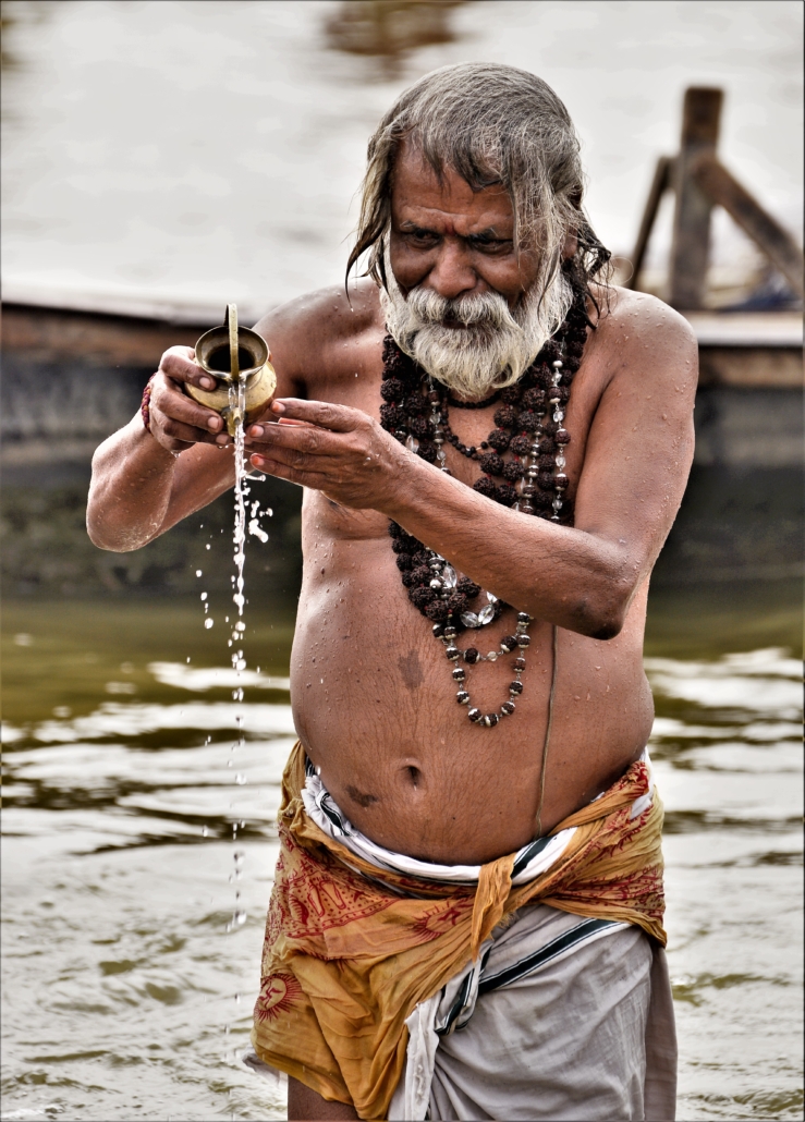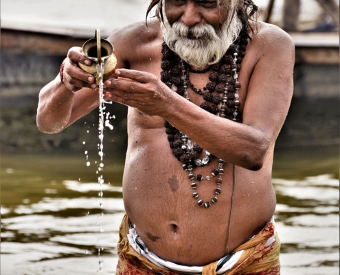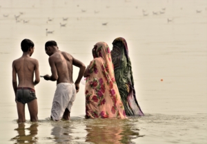 Sorprende a veces al occidental que tiene un primer contacto con India la creencia de que el baño de acceso a la liberación – moksha- pero hay que recordar que para el hinduismo no es un simple baño, sino la inmersión en la diosa que otras tradiciones como el cristianismo y el islam conceden un importantísimo papel purificador al agua y que para las ramas más metafísicas del hinduismo, el baño es un ritual que canaliza la intención de adquirir esa purificación, a la que se accede a través de la devoción – bhakti- y el conocimiento –jñana-
