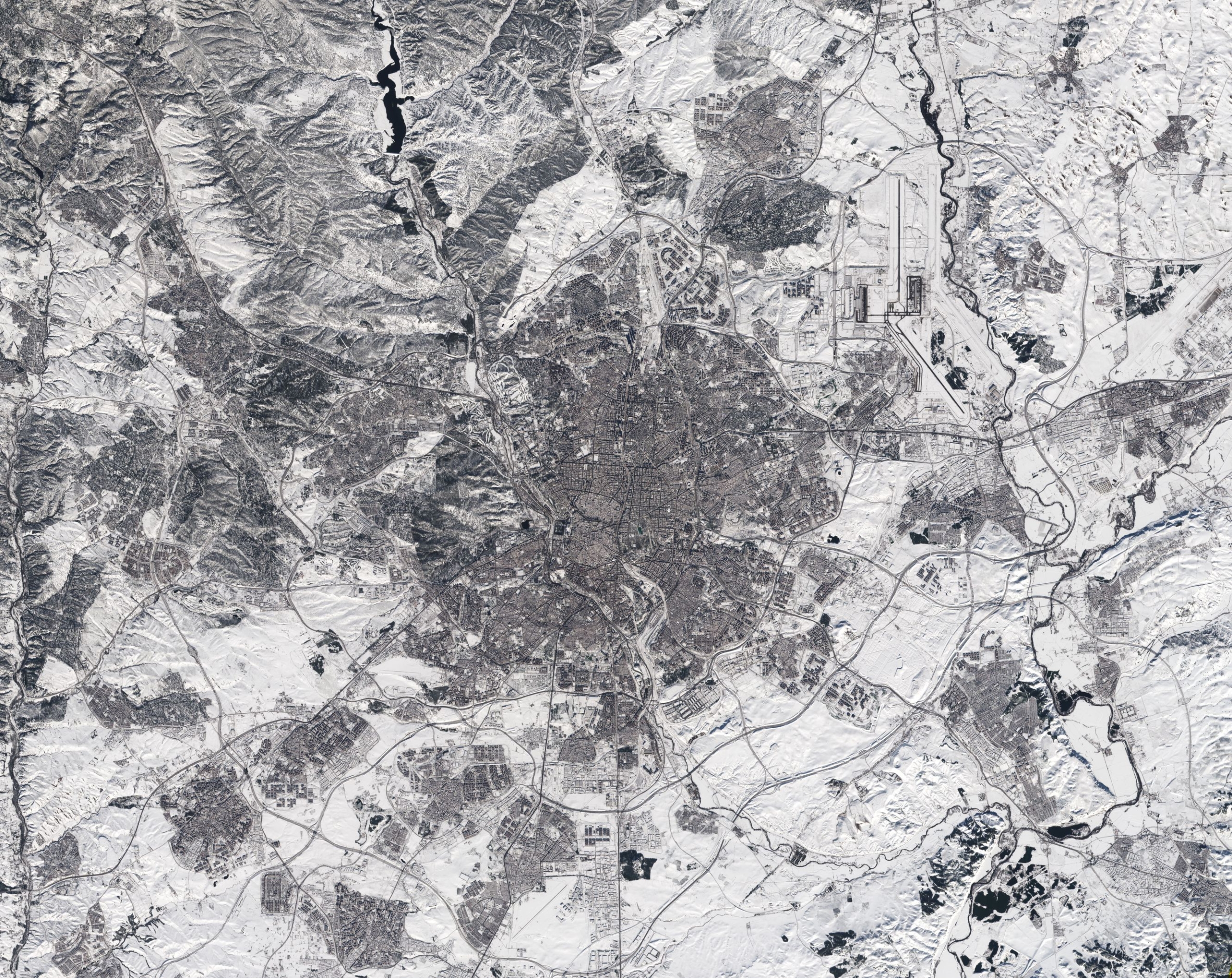 Aunque esta imagen por satélite fue tomada una vez que la borrasca había pasado, es evidente que aún queda mucha nieve, especialmente en las afueras de la ciudad. Por ejemplo, algunas de las pistas del aeropuerto, que se aprecian en la parte superior derecha de la imagen, siguen cubiertas de nieve. Se espera que las temperaturas excepcionalmente bajas que está experimentando la península ibérica continúen a lo largo de la semana, llegando a alcanzar –12 °C.