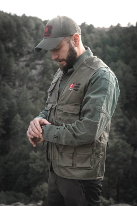 Cuenta con 9 bolsillos frontales, dos de ellos en la parte posterior, y cierre de cremallera.