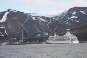 Llegada de un crucero de turistas a Longyearbyen. A la izquierda la central térmica que da energía a la ciudad