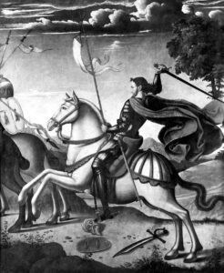 Óleo sobre tabla de Santiago en la batalla de Clavijo. Escuela valenciana. Anónimo. Siglo XVI.