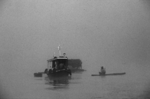 Dos barcazas y una canoa, envueltas en la bruma, navegan por el río Amazonas.