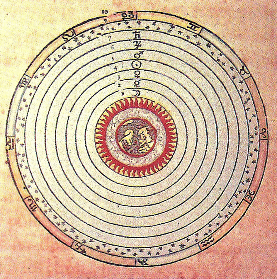 El modelo geocéntrico del universo en Aristóteles y Claudio Ptolomeo, con los astros rotando en torno a la Tierra inscritos en sus propias esferas circulares.