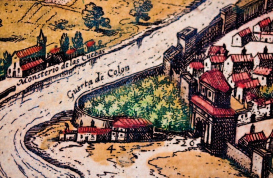 Grabado de época con la localización de la casa de Hernando Colón junto a la Puerta de Goles de Sevilla, donde instaló su biblioteca.