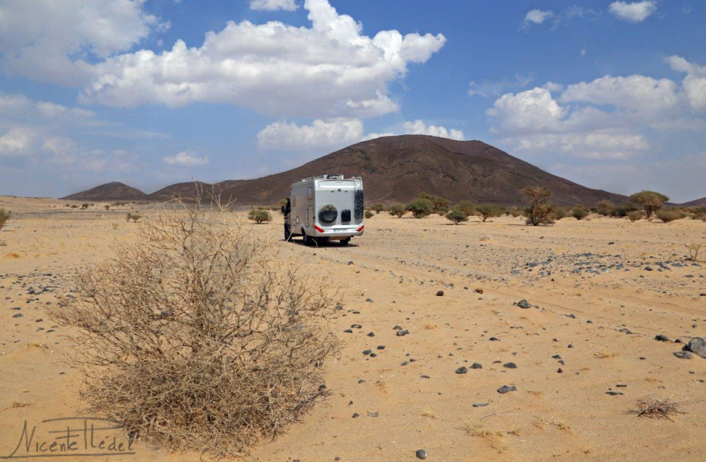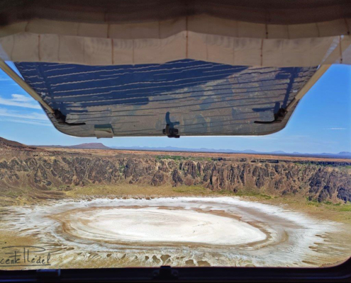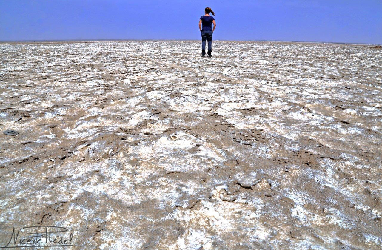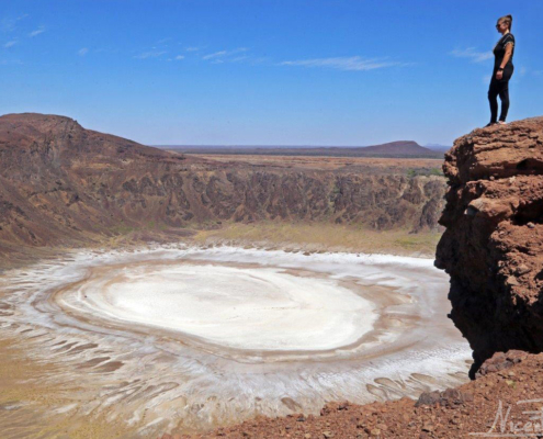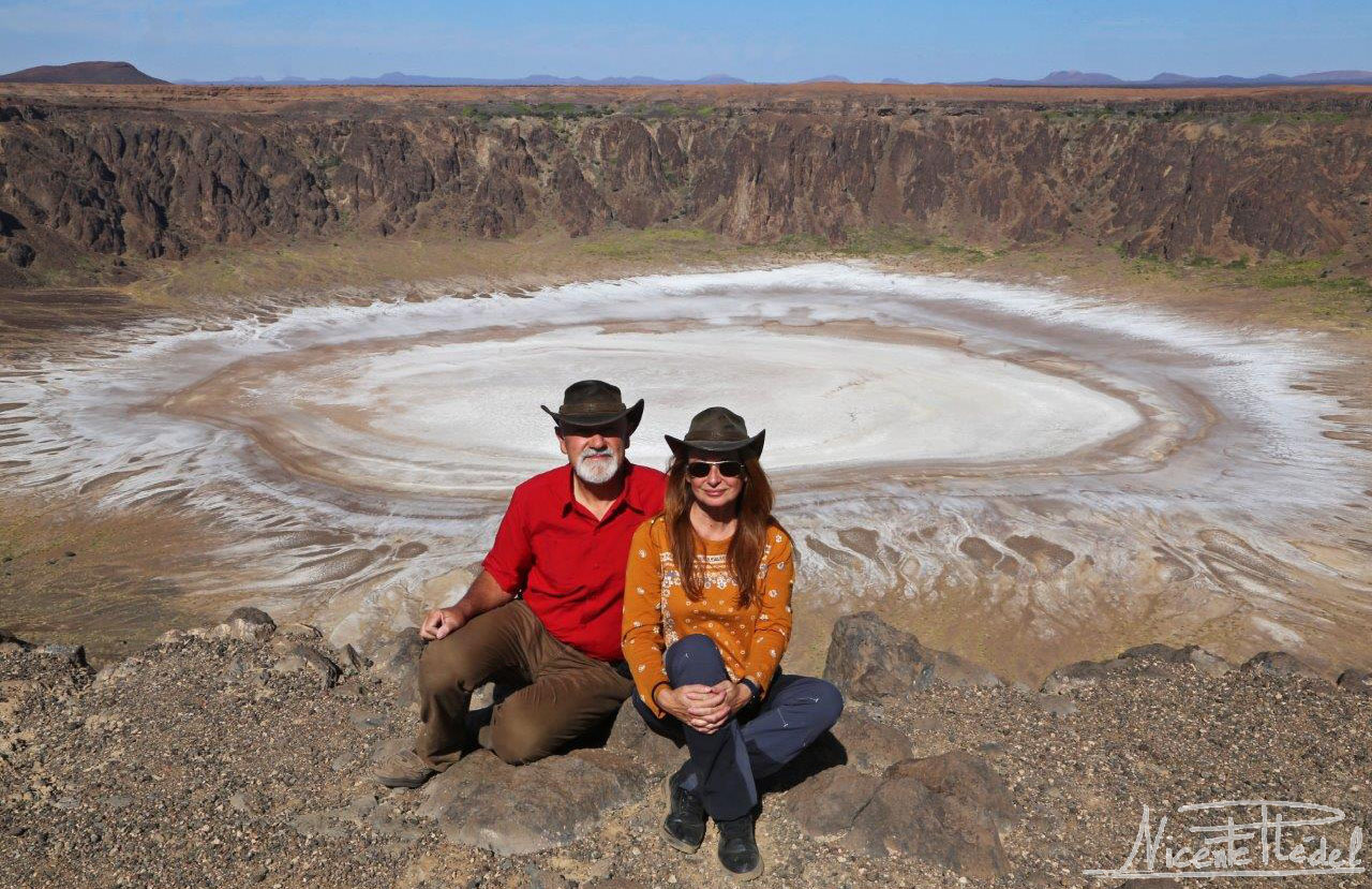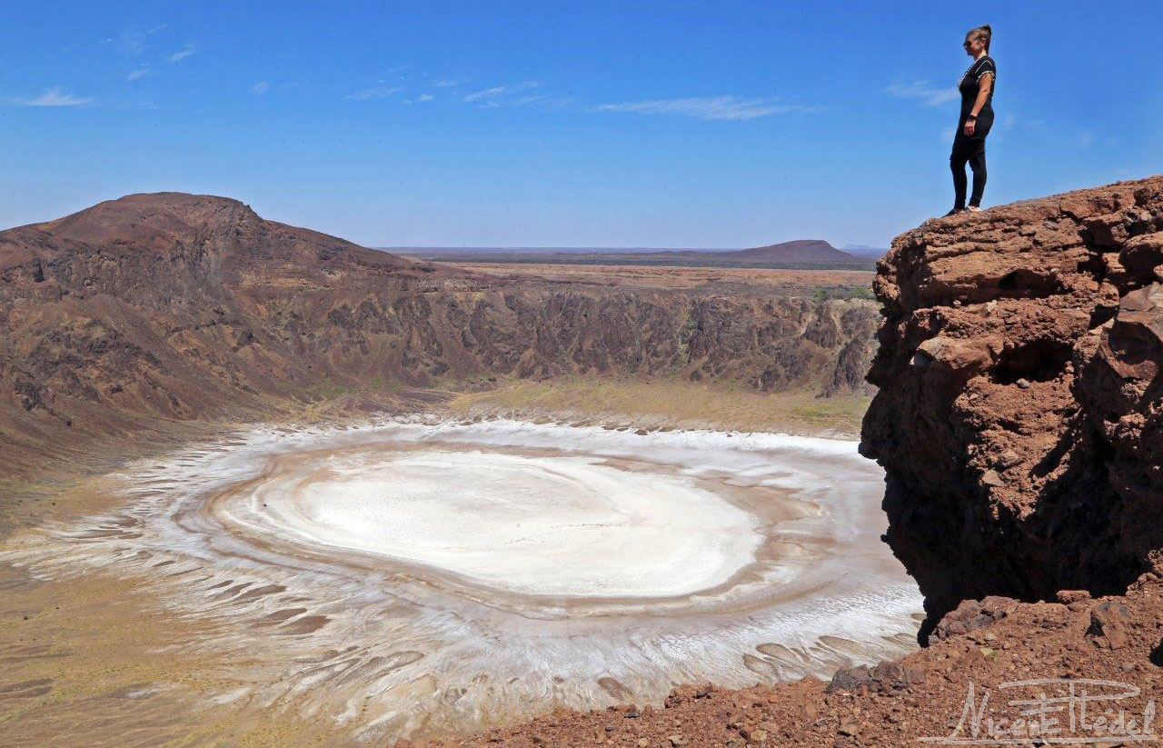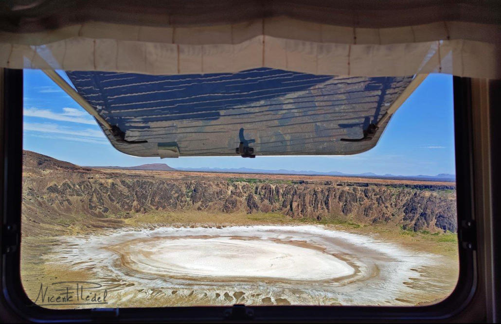 El fotogénico lago salado seco que ocupa el interior del cráter luce, bajo los rayos del sol, con todo su esplendor. Como un gigantesco ojo en la tierra que nos observa sin parpadear… consigue hipnotizarnos para que no lo abandonemos, y decidimos quedarnos unos días. Cuesta dejar de mirar ese ojo blanco y todo su entorno, por el que nos movemos como en un sueño. Una vez más, la libertad que te brinda viajar con la casa a cuestas.