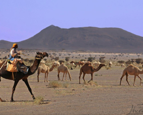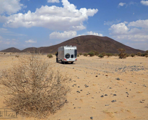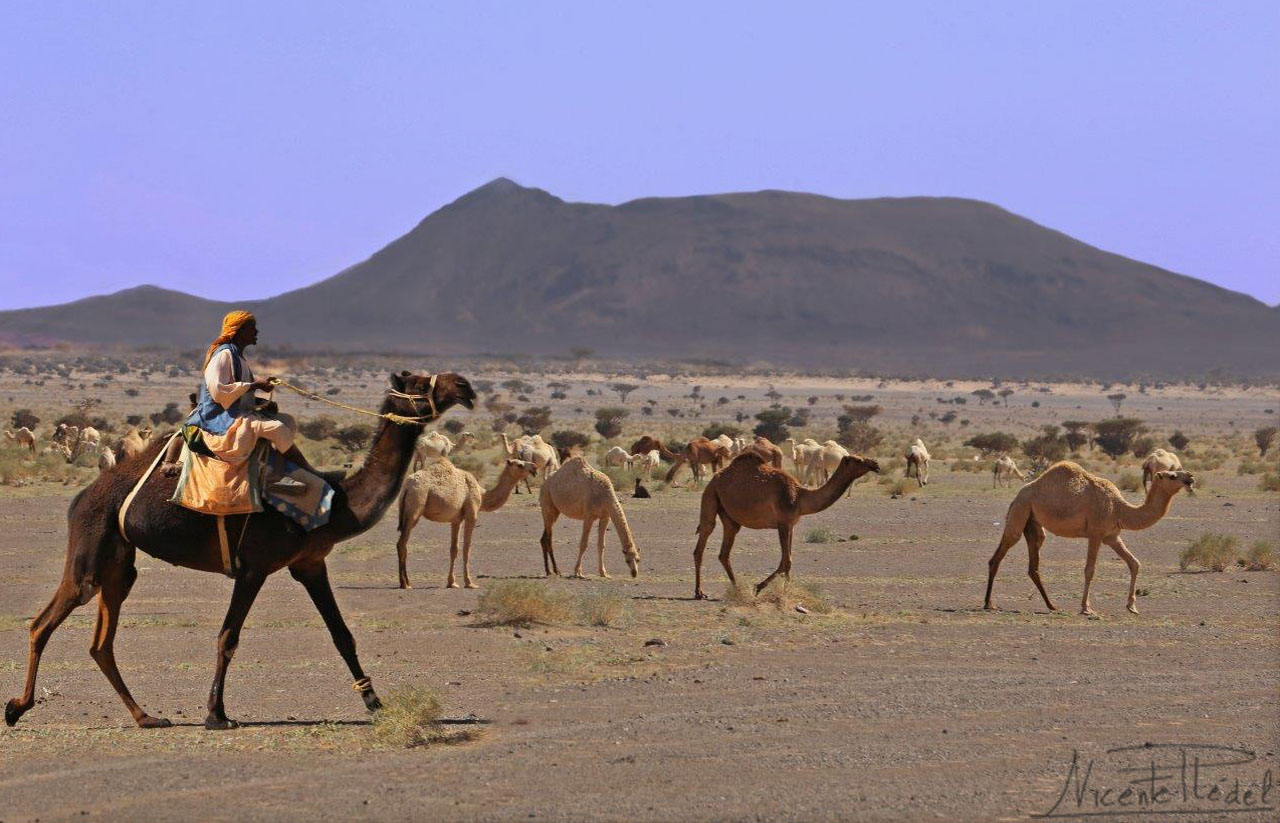 Para alcanzar este lejano y emblemático hito geológico, escondido en el desierto saudita, recorremos la gran meseta basáltica de Harrat Kishb, surcada por los reyes del desierto: los dromedarios. Por este espectacular y desolador entorno, los camelleros vigilan el avance de sus rebaños. Las costras de sal que cubren trechos del desierto crepitan bajo nuestros pies cuando nos acercamos a contemplarlo.