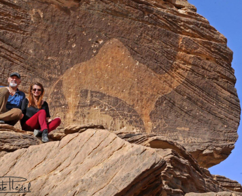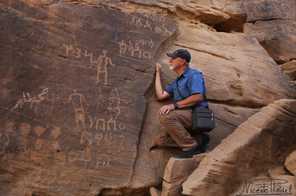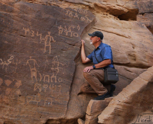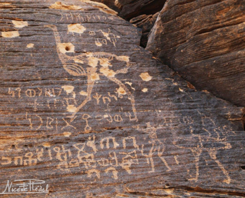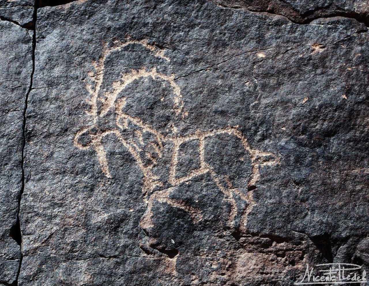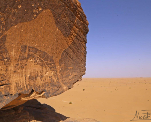 Hace más de 7.000 años, la vida silvestre y el agua cubrían las resecas arenas del desierto por el que avanzamos. Todos los seres vivos que disfrutaban de un bucólico ecosistema fueron desapareciendo poco a poco con la desertización. Afortunadamente, los diversos episodios de la historia que se fueron sucediendo a lo largo de milenios, quedaron plasmados en las rocas por sus sagaces habitantes. También pastores nómadas, viajeros, comerciantes, ejércitos… fueron dejando su huella mediante inscripciones y petroglifos en un entorno que iba mutando.