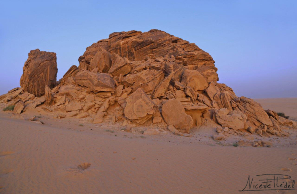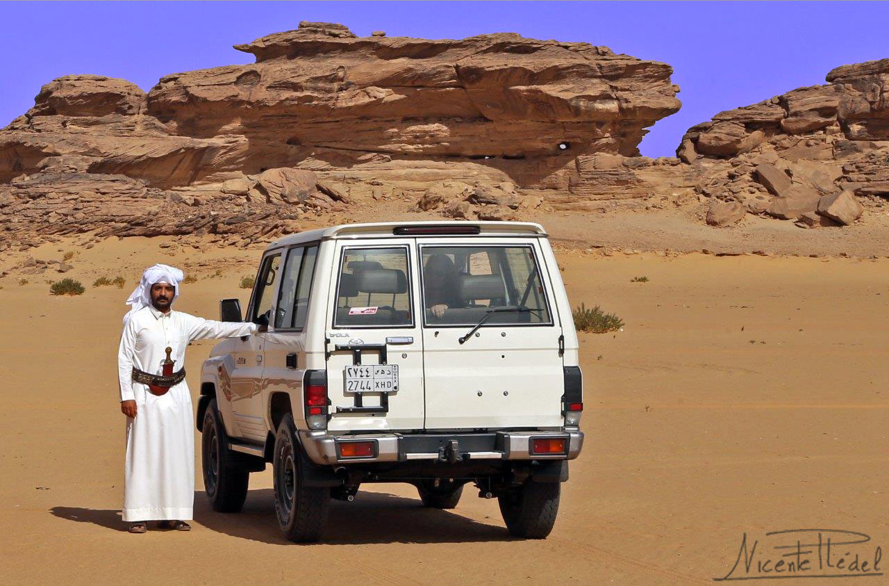 Con Abdulá, dejamos nuestro exuberante oasis de Nayarán para introducirnos en el desierto puro y duro. Entre rocas y arena se nos va revelar en la zona de Hima, otro de los maravillosos tesoros que posee Arabia Saudita y que se ha sido reconocido por la UNESCO como Patrimonio de la Humanidad.